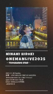 3011月日曜日 MINAMI HIROKI ONEMANLIVE2025 〜thousands star〜 開場/開演時間: 18:00 - 18:30 チケット料金: 3,000円(税込)出演者: 南宏貴 詳細